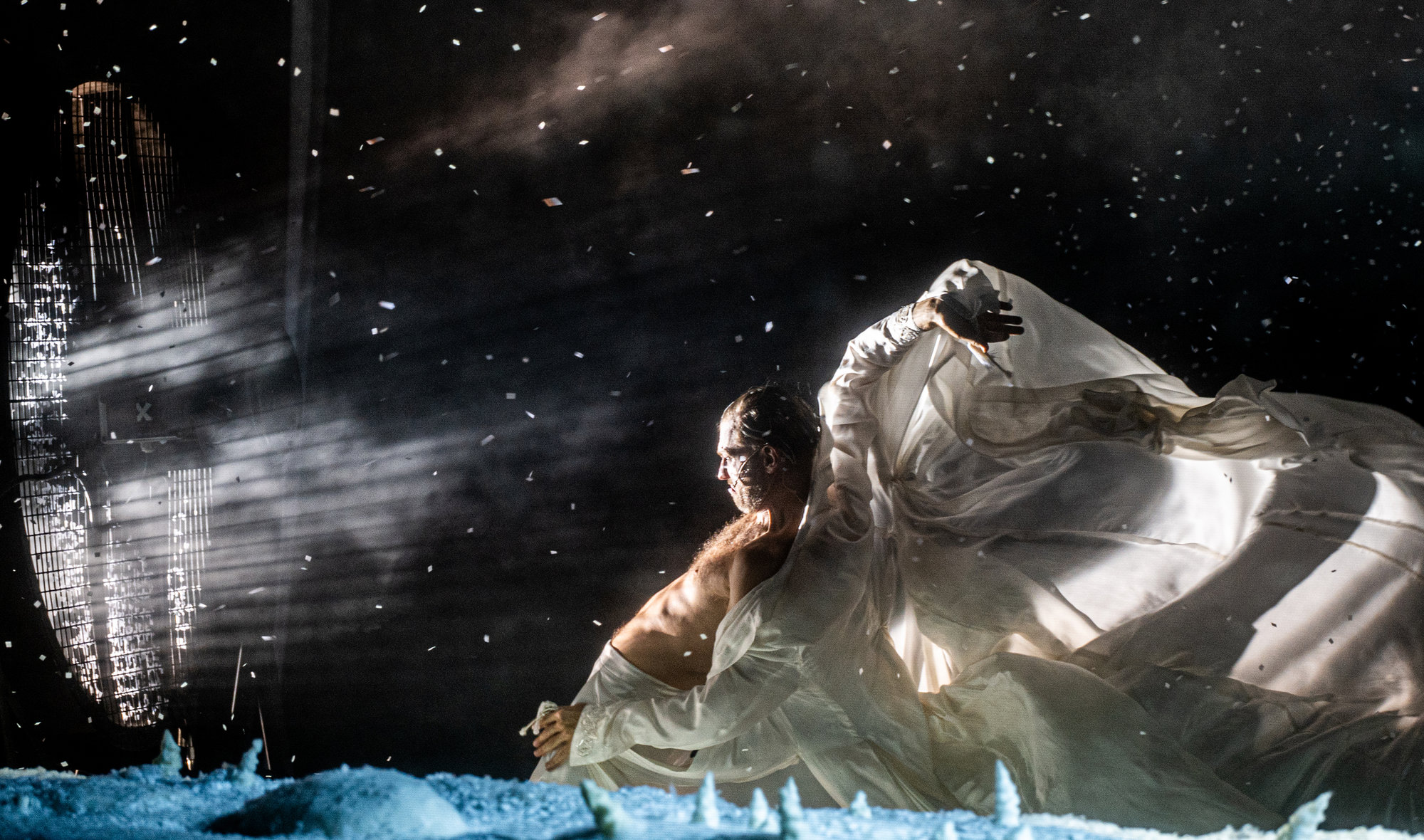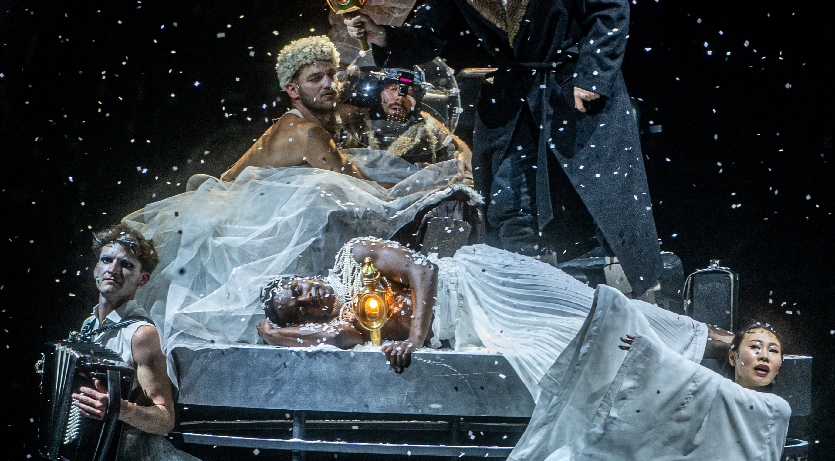 In Serebrennikovs Inszenierung wird der Schneesturm selbst zur dritten Hauptfigur. Mit Schauspiel und Musik, Tanz und Live-Projektionen verwandelt er Sorokins Text in ein ekstatisches Bühnenerlebnis – vielstimmig, verführerisch, verstörend. Inmitten eines rauschhaften Whiteouts entfaltet sich ein existenzielles Cabaret zwischen Märchen und Dystopie und führt das Publikum in einen sinnlichen Kontrollverlust.